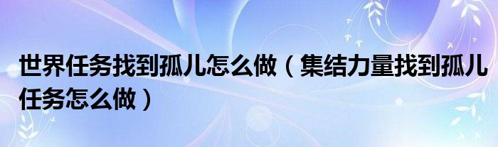 关于世界任务找到孤儿怎么做,集结力量找到孤儿任务怎么做这个很多人还不知道,今天菲菲来为大家解答以上的问题,现在让我们一起来看看吧!