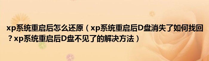大家好,今天小悦来为大家解答以上问题。xp系统重启后怎么还原,xp系统重启后D盘消失了如何找回?xp系统重启后D盘不见了的解决方法很多人还不知道,现在让我们一起来看看吧!