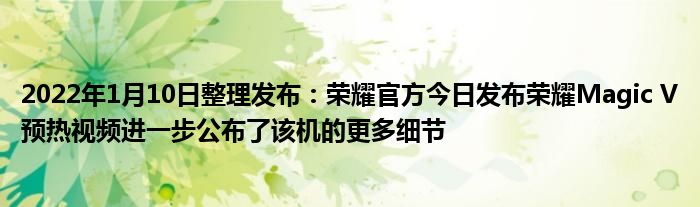 2022年1月10日整理发布:1月10日晚19:30,荣耀首款折叠旗舰——荣耀Magic V将正式发布,荣耀CEO赵明表示,新机将在折叠形态、性能体验和应用场景三个维度带来革命性创新突破。