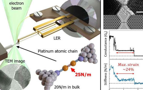 研究人员设计了一种实验装置,其中将一个小的Pt接合点拉伸到其绝对断裂点,也就是当两个Pt片段通过一个2至5个原子的单原子链连接时。通过仔细地对准TEM中的零件,他们实时观察到了单原子Pt链的形成和断裂。此外,他们使用石英LER测量了整个链的电导及其刚度,从而成功地计算出各个Pt键的强度。“我们发现了纽带单原子Pt链中的25 N / m的强度非常高,特别是与块状Pt晶体中通常发现的20 N / m相比,”张说。“此外,这些单原子键可以拉伸约24%它们的规则距离与大量Pt原子之间的键可以拉伸的5%形成鲜明的对比,”他补充说。