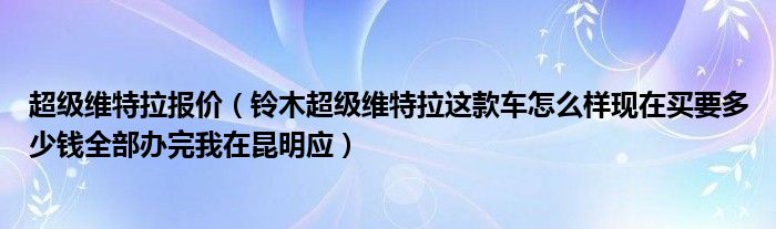 1,铃木超级维特拉这款车怎么样现在买要多少钱全部办完我在昆明应:价格各地不同,不熟悉昆明的市场,问问当地的经销商维特拉是一款进口车,感觉没有多少价值动力一般,保养费用高维修不方便换个机油滤清器就一百多