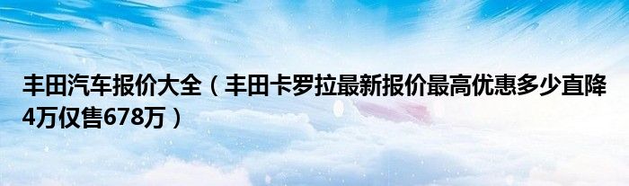 1,丰田卡罗拉最新报价最高优惠多少直降4万仅售678万 :这个优惠是不可能的,卡罗拉这款车目前可以在指导价的基础上优惠1.2万元左右。