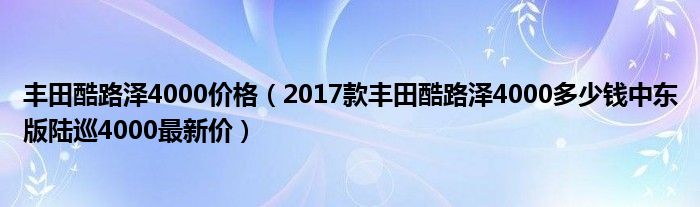 1,丰田酷路泽4000价格 最新款酷路泽多少钱:2017款 丰田兰德酷路泽4000 天津盛源:¥62.00万左右配置: 卤素大灯,17轮,胎压监测,高位刹车灯,脱钩,底挂备胎,智能卡,一键启动,巡航定速,冰箱,5座绒布座椅,手动座椅,两气囊,中央差速器,车身稳定,上坡辅助,弯道辅助,电子加速,低速巡航驾驶辅助系统,全时四驱,上坡辅助,蠕动模式,电脑自动感应悬挂系统,http://dealer.okeycar.com/31516/spec-91166.html