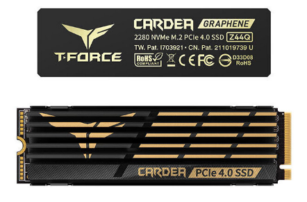 “T-FORCE CARDEA Z44Q PCIe 4.0 SSD 硬盘配备两个专利散热模块,游戏玩家可以自由互换。获得专利的高强度铝散热片(专利:M541645)可以倍增散热效果,而获得专利的超薄石墨烯散热片(专利:I703921;中国专利:CN 211019739 U)具有超轻的体积,易于组装和低干扰。两个冷却模块都可以有效地冷却 SSD,使其成为 PCIe SSD 的重要补充,以实现冷却和性能。”