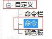 1、打开菜单栏,在菜单栏中点击“选项”并进入。在“选项”窗口界面中点击“工作区”展开其子选项,然后找到“自定义”点击后随即点击“命令”;